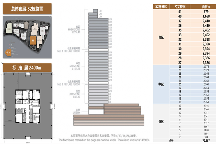 名义层41层实际38层,办公高度180米,办公层数6层-26层,净高3米,架空地板150mm,标准层面积2400平方米,单价9万-16万,总价1.7亿起