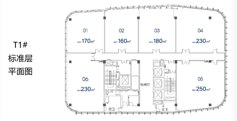 T2办公单套散售,总面积约24900平米,楼层6-21层,电梯配置:6客1货2转换,大堂约12.5米,标准层高4.5米,公共区域精装,套内架空地板 VRV中央空调+新风系,整层面积:1550㎡ ,单套面积:150㎡-290㎡,单价2.9万-3.3万/平米,总价:450万-4650万