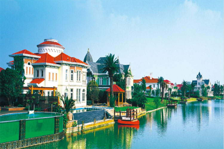 庄园以欧美经典城堡为母本,以岛屿与海洋的相互关系为生态主题,设计了18座精巧岛屿及半岛、5片湖泊,3条自然河和覆盖全区的若干支流,3000多棵雄冠大树建成的生态园区,整座庄园似一座世外桃源。