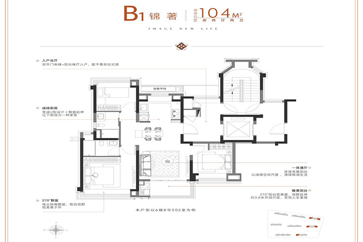 住宅总高18层,类一梯一户,独立电梯厅,阳台270°采光,建面约94平(3房2厅2卫)、约104平(3房2厅2卫),约128平(4房2厅2卫),均价5万/平,总价450万左右