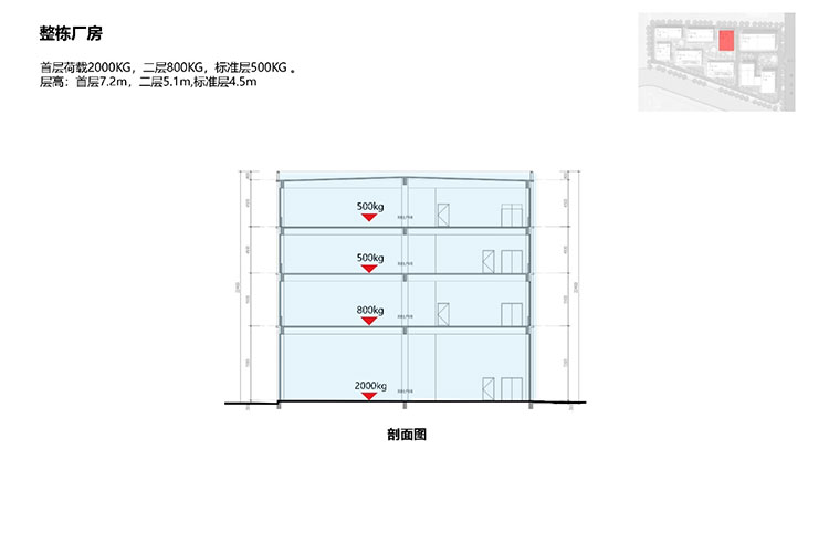 独栋四层结构,首层7.2米层高+2000kg/㎡,二层5.1米层高+800kg/㎡,三四层4.5米层高+500kg /㎡