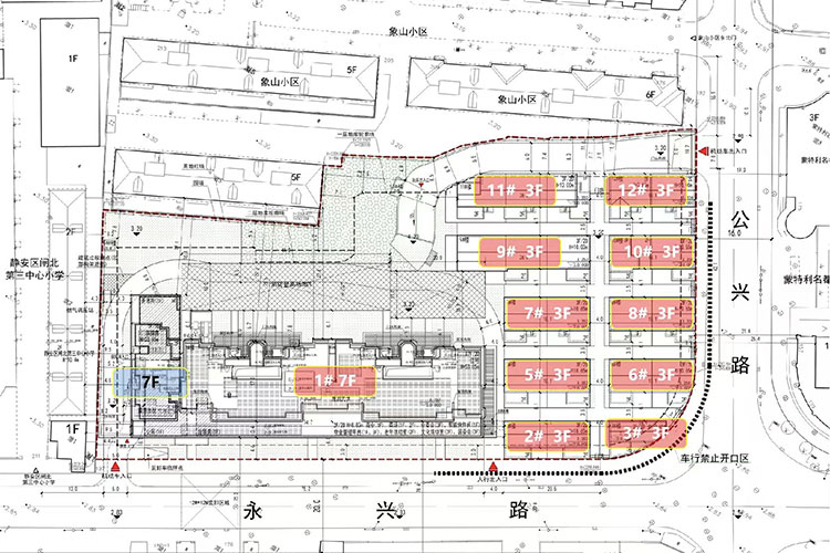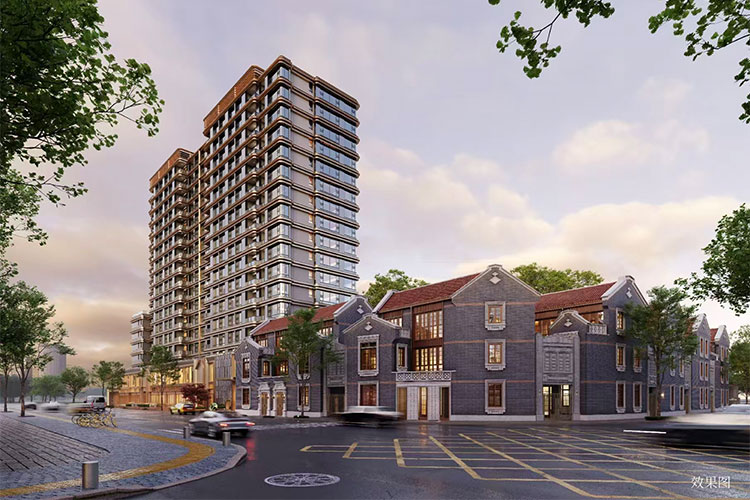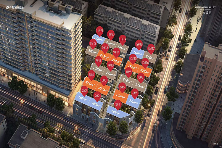 保利永兴里由保利发展开发,占地0.76万方,建面2万方,是一个低密度住宅区,容积率仅2.5,绿化率高达35%。由1栋17F小高层+10栋3F低密风貌别墅组成。 仅21席城央双拼风貌别墅;社区采用海派建筑风格,红砖清水+拱形门坊,复刻和平饭店酒店式门庭,五进归家礼序;并规划了约3500㎡的景观带。物业服务由保利物业提供华尔道夫级酒店式管家服务,提供24小时管家服务。