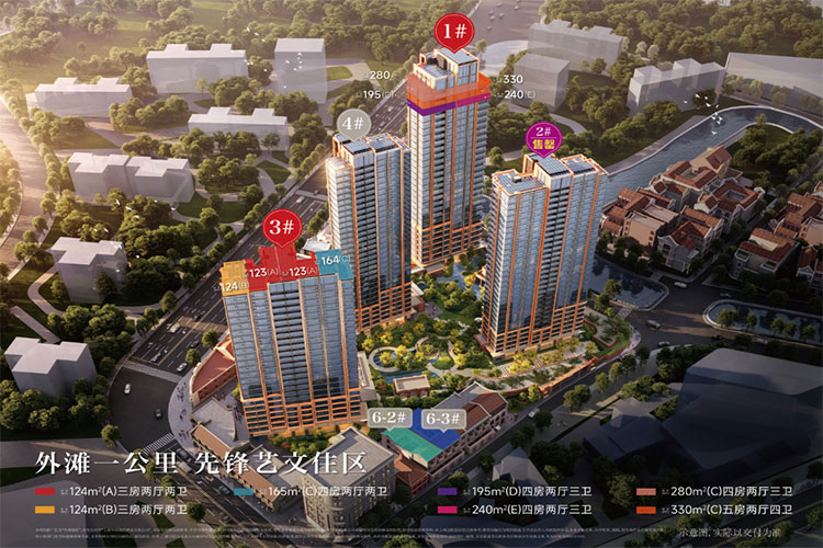 1栋24层住宅、3栋 31-32层住宅,建筑面积124平三房两厅两卫、165平四房两厅两卫、190平四房两厅三卫、240平四房两厅三卫,均价:14.83万/平,总价1600万起
