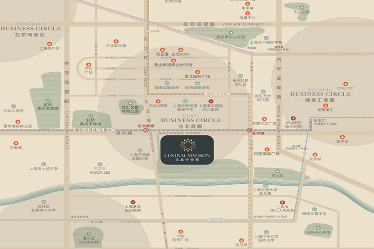 古北中央萃位于闵行区金虹桥板块,内中环间,是闵行、徐汇、长宁三区重合交叠,紧邻古北国际社区,东接徐家汇、南邻漕河泾、西靠万象城 / 爱琴海、北连古北 1699 / 高岛屋 / 黄金城道,国际社区,拥有黄金城道步行街等高端生活范式。