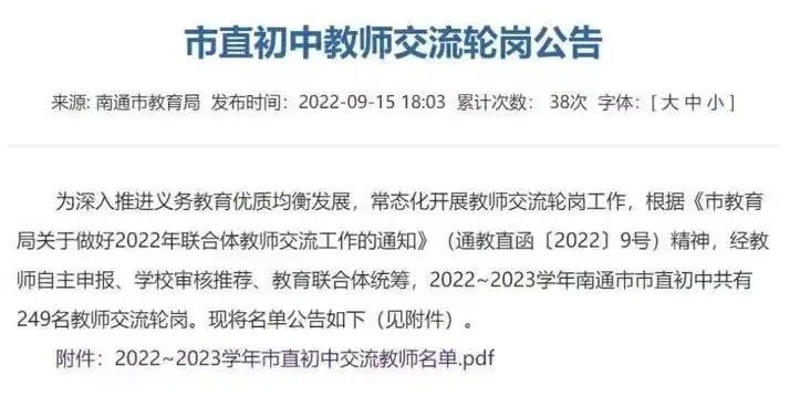 前天南通教育局发布文件,2022-2023学年南通市直初中,将有25所学校249名教师交流轮岗;